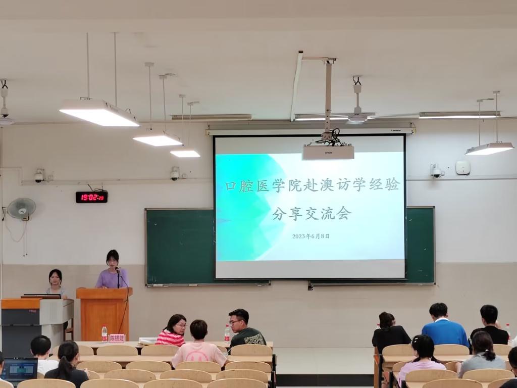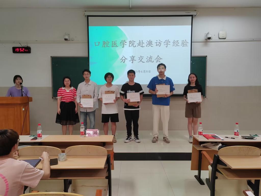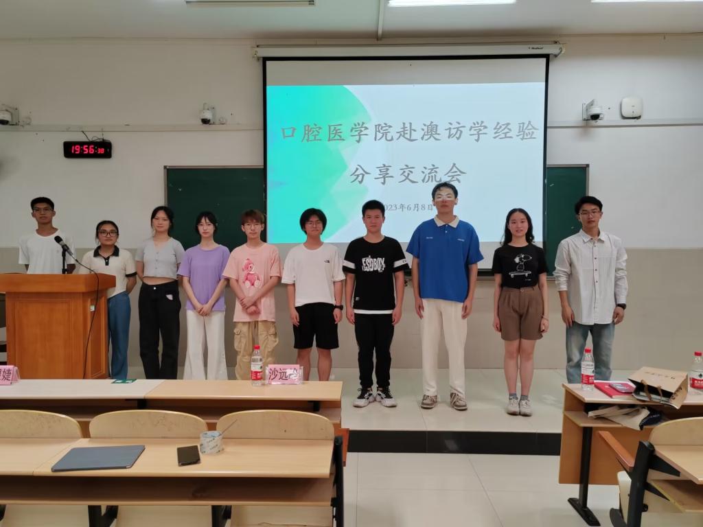 近日,口腔医学院团委在临桂校区教学南楼开展2023年赴澳访学朋辈交流会。口腔医学院团委书记沙远峰、学工办老师陈银婕参加会议,学院获得资助的同学开展交流分享,各班级同学代表参加交流会。