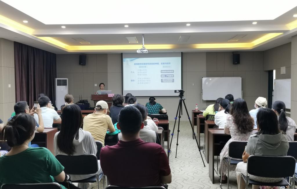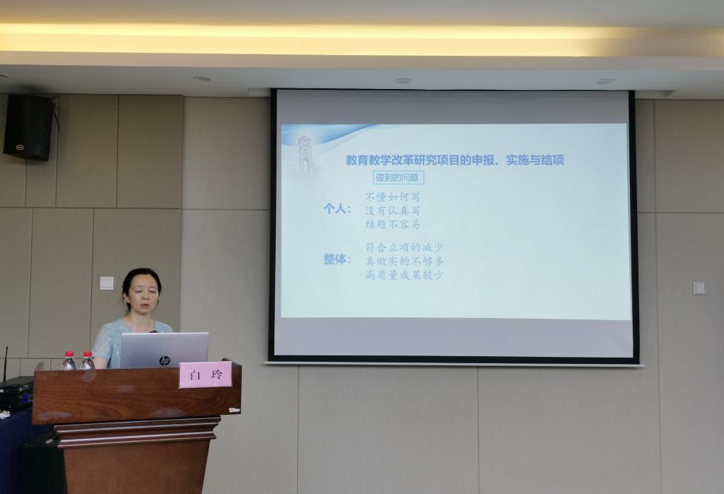 白玲教授从事高等医学教育36年,先后主持和参与自治区级以上教改课题项目10余项,多次参加校级教改项目的评审和指导工作,有丰富的教改项目建设和评审经验。在培训会上,她结合自己多年丰富的教学研究与建设经验,深入浅出地分别从教研相关概念的明确,教研项目的选题以及教研项目申报书的填写等方面为到场教师做了详细的讲解。此外,她还运用丰富的案例,从专家评审的角度,对项目申报书的填写以及教改项目申报和建设中容易出现的问题、撰写技巧等对到场教师进行了指导。